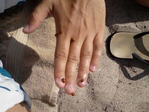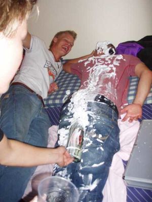 Haha... Det blev faktisk værre endnu! Kan desværre ikke finde resten af billederne - eller tror desværre vi kun fik resten på video... Efter det sidste billede, hivede de hans bukser af, og flasken kom op et sted hvor solen ikke skinner smilie Og han blev dækket med blade og sand, og hældt øl udover ham... Hehe!